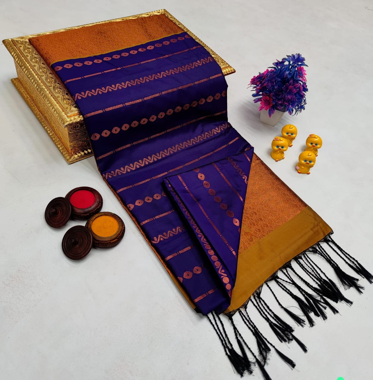 Drape yourself in the luxurious embrace of our Kachipuram soft silk saree, a testament to India's rich weaving heritage. Crafted with a delicate blend of traditional artistry and modern comfort, this saree offers the iconic grandeur of Kanchipuram silk in a wonderfully soft and lightweight drape.