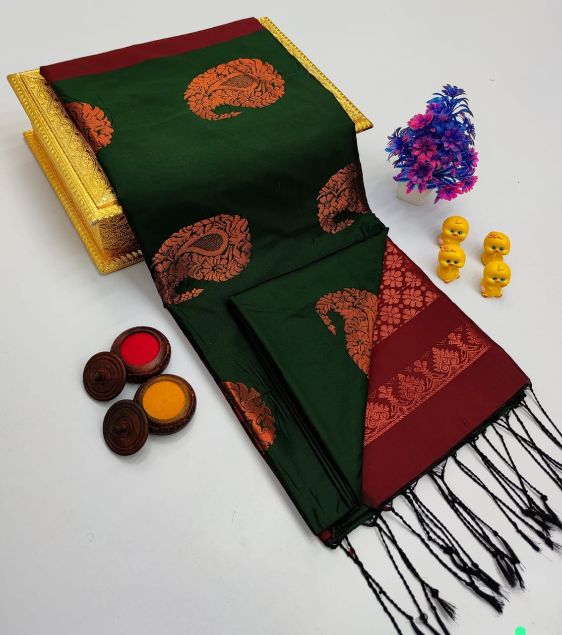 - Features classic Kachipuram-inspired motifs and a rich border design.