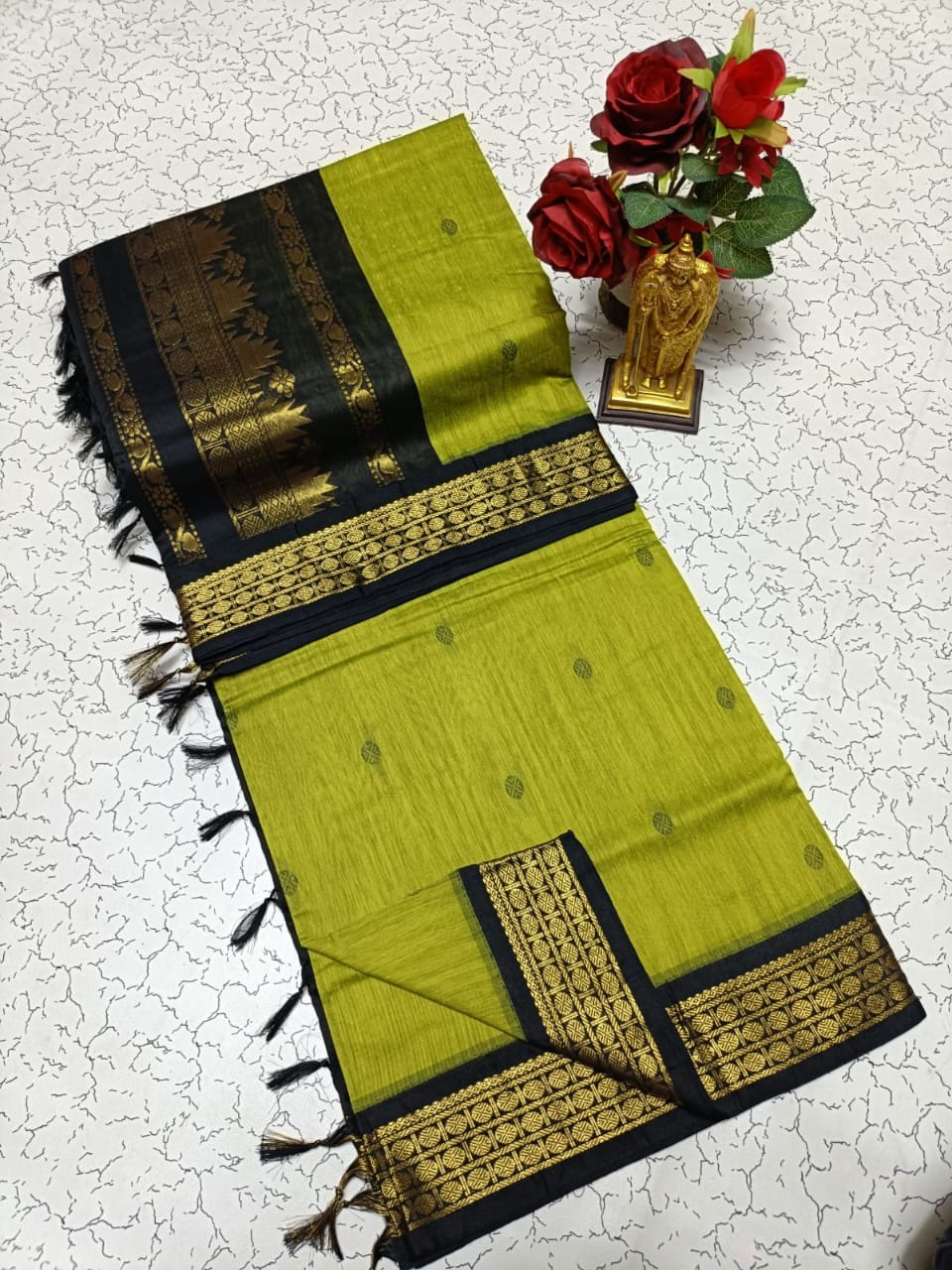 - The entire saree body is embellished with charming thread puttas, adding intricate detail.