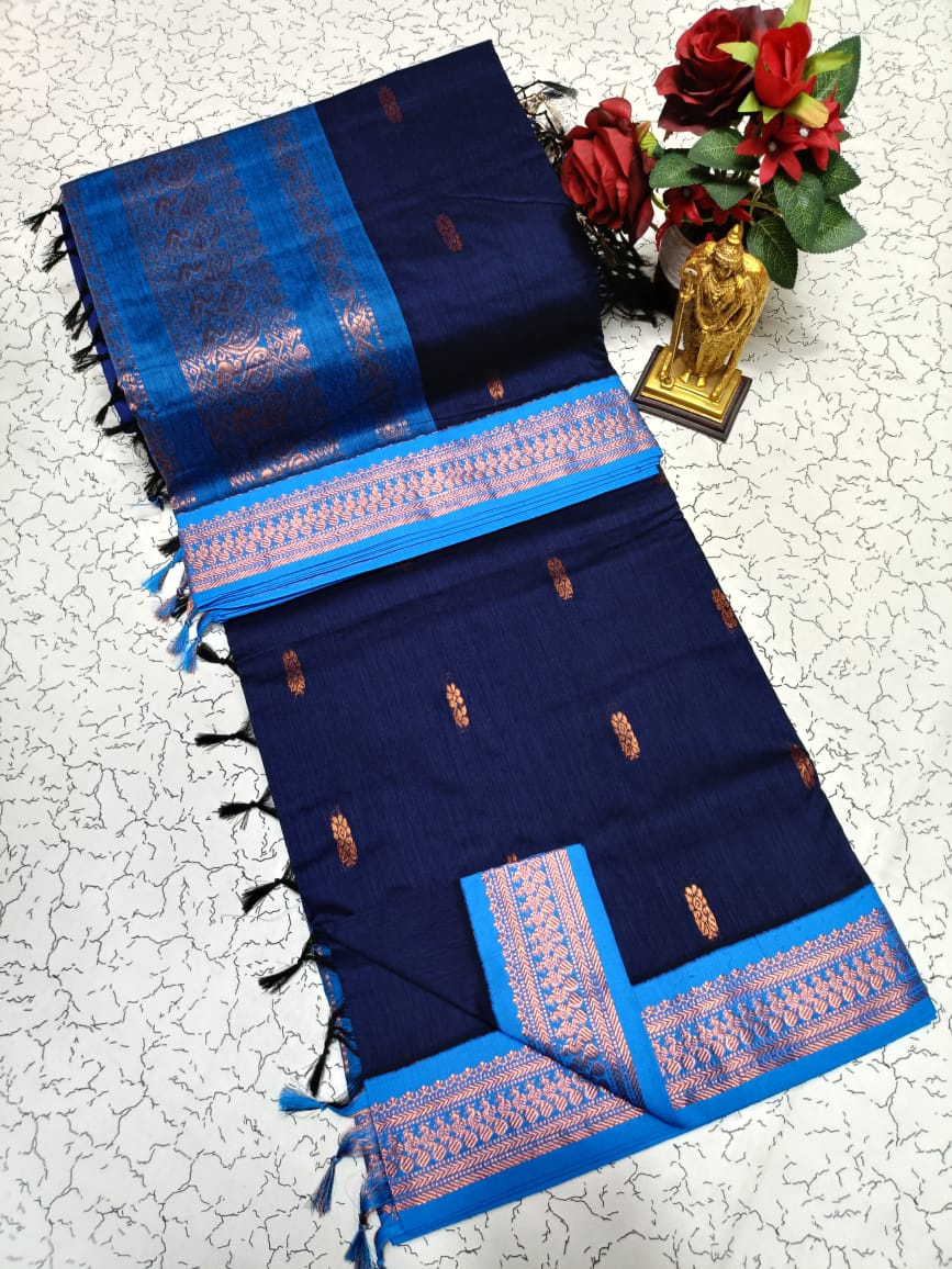 Drape yourself in the exquisite comfort of our Kalyani Cotton Saree, a true celebration of traditional Indian craftsmanship. Made from 100% original, first-quality 2/100 count acrylic and cotton threads, this saree promises a very soft and smooth feel against your skin, adorned with delicate thread puttas all over.